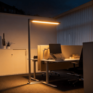 Un lampadaire LED orientable améliore le confort visuel sans encombrer le plan de travail.