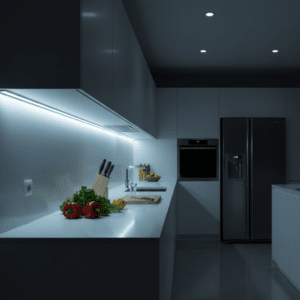 2. Éclairage fonctionnel : Un ruban LED 4000K pour le plan de travail.