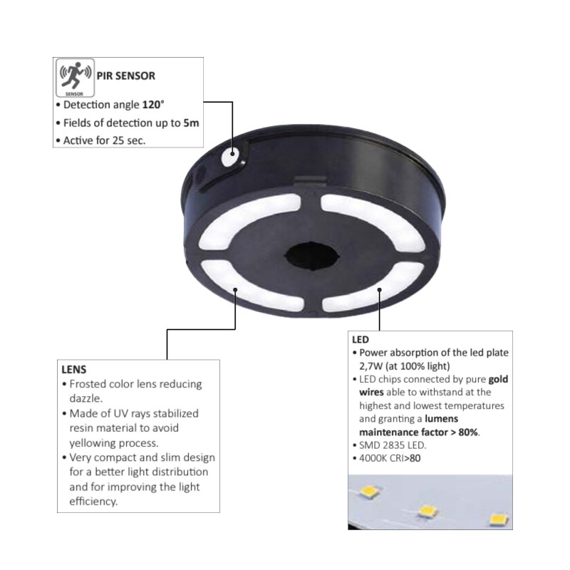 Angle de détection PIR : 120°, portée jusqu’à 5 m