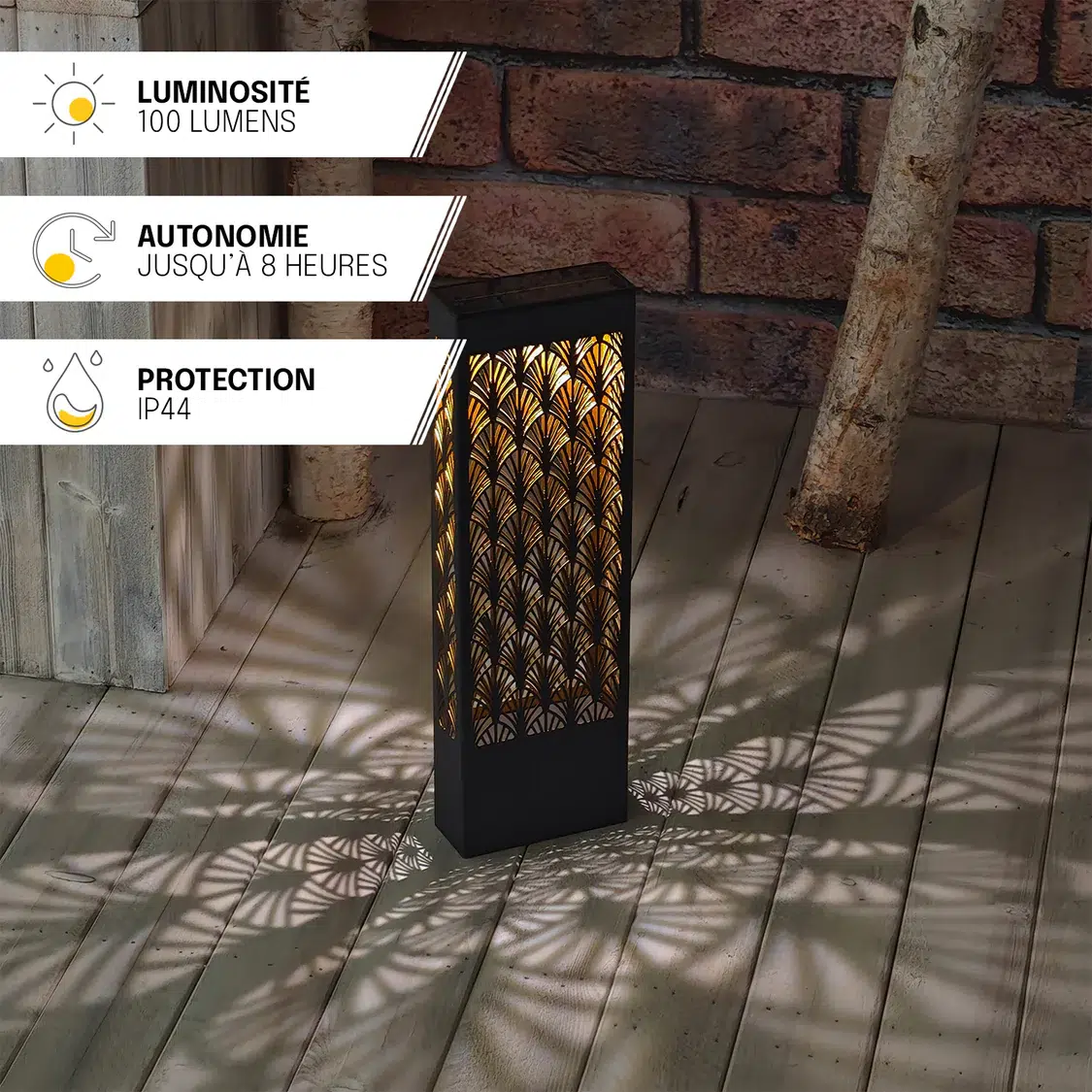 Son fonctionnement repose sur une alimentation 100 % solaire, avec la possibilité de la recharger via USB en cas de faible ensoleillement. Elle est équipée d’un capteur crépusculaire pour un allumage automatique à la nuit tombée, et propose jusqu’à 8 heures d’autonomie. Fabriquée en PE et métal avec un indice de protection IP65, elle résiste parfaitement aux intempéries.