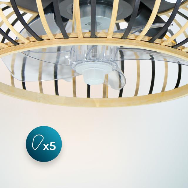 Apportez élégance et confort à votre intérieur avec le ventilateur de plafond Cecotec 5P LampAero600. Doté d’un moteur DC de 20 W, il offre un débit d’air puissant tout en restant économe et silencieux. Ce modèle allie praticité et esthétique avec son abat-jour en bois, sa lampe intégrée avec 3 teintes lumineuses, et ses 5 pales aérodynamiques de 11 pouces qui assurent une ventilation optimale. Contrôlez aisément ses 3 vitesses et son mode Été/Hiver grâce à la télécommande incluse. La minuterie programmable (30 min, 1h ou 2h) complète cet appareil, idéal pour toutes les saisons.