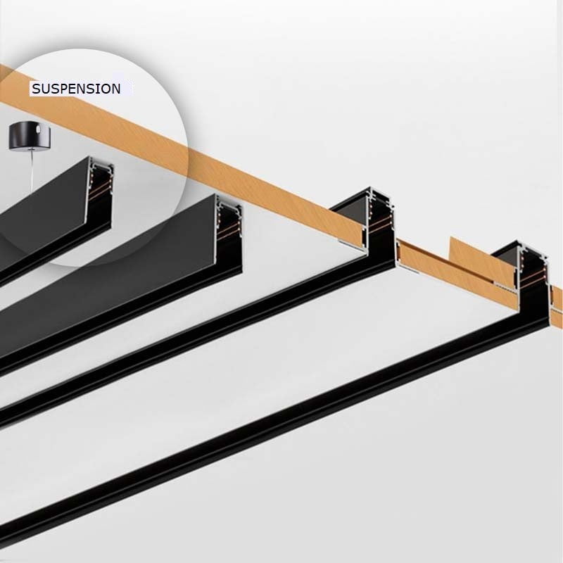 Notre pack de rail magnétique et de kit de suspension permet l’installation du rail suspendu au plafond, avec la possibilité de régler la hauteur jusqu’à 1,2m.
