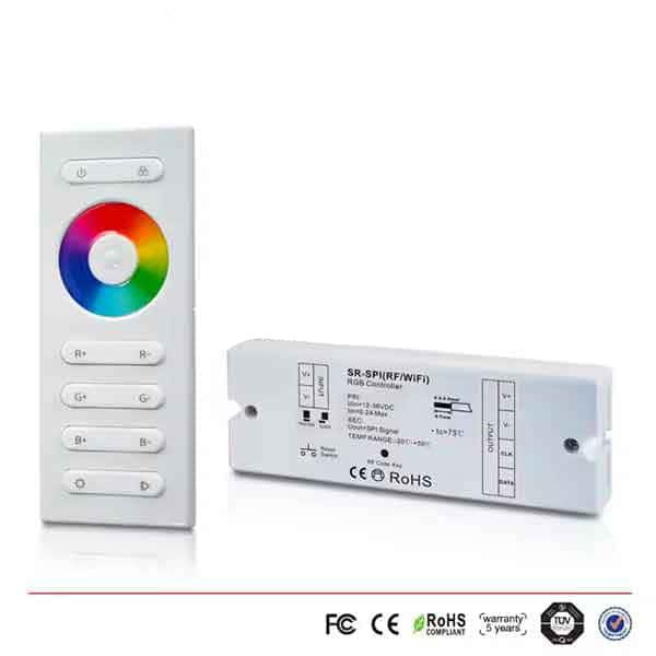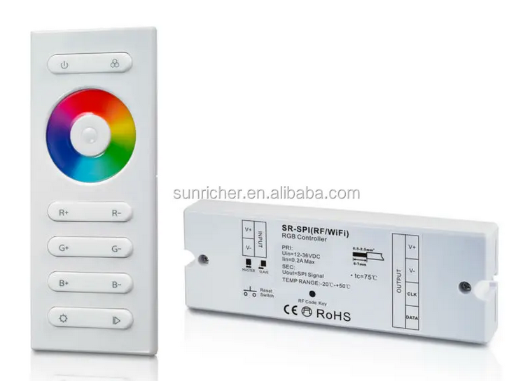 Le SR-2839/K est une télécommande RF à zone unique facile à utiliser pour contrôler les LED RVB avec une molette tactile couleur qui offre un réglage précis de la tonalité des couleurs et 10 modes de changement intégrés sont disponibles. La luminosité de chaque couleur est réglable séparément et en douceur par des boutons. Le contrôleur RVB peut jouer des motifs changeants dynamiques à différentes vitesses.