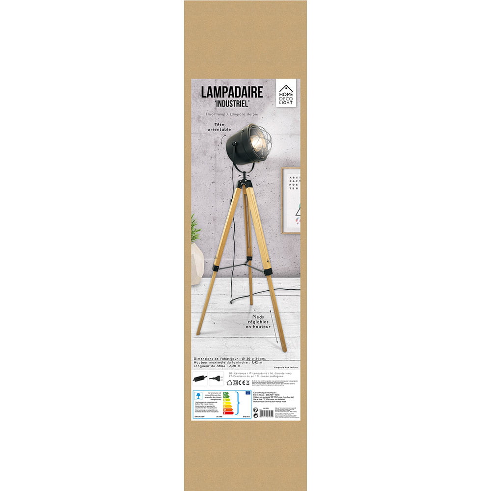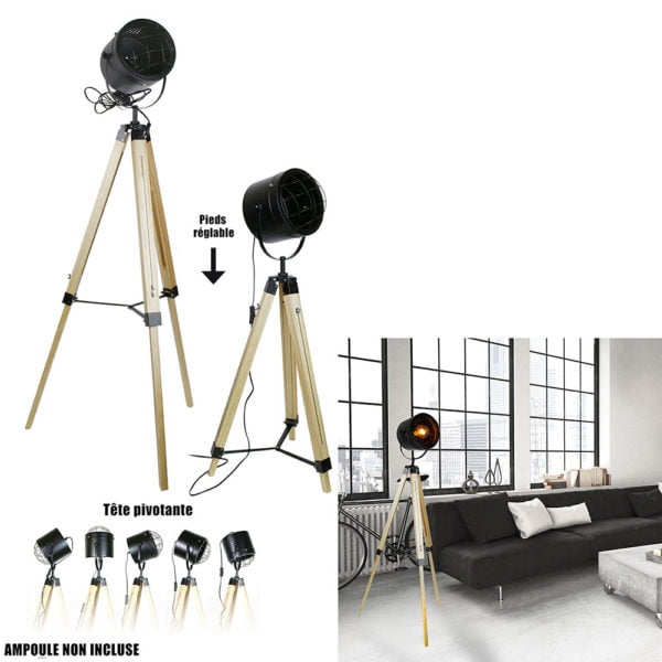 Donnez un effet 100% industriel dans votre intérieur avec ce lampadaire ! Son trépied en bois est réglable, il lui offre une très bonne stabilité, sortez le grand jeu à vos convives lors de vos réceptions, succès garanti !