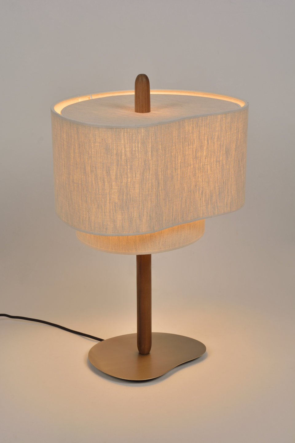 Apportez une touche organique et élégante à votre intérieur avec cette lampe à poser en tissu crème et bois naturel, au design inspiré des formes sculpturales contemporaines. Composée de deux abat-jour en tissu superposés, elle diffuse une lumière douce et tamisée idéale pour créer une ambiance chaleureuse dans un salon, une chambre ou un coin lecture.
