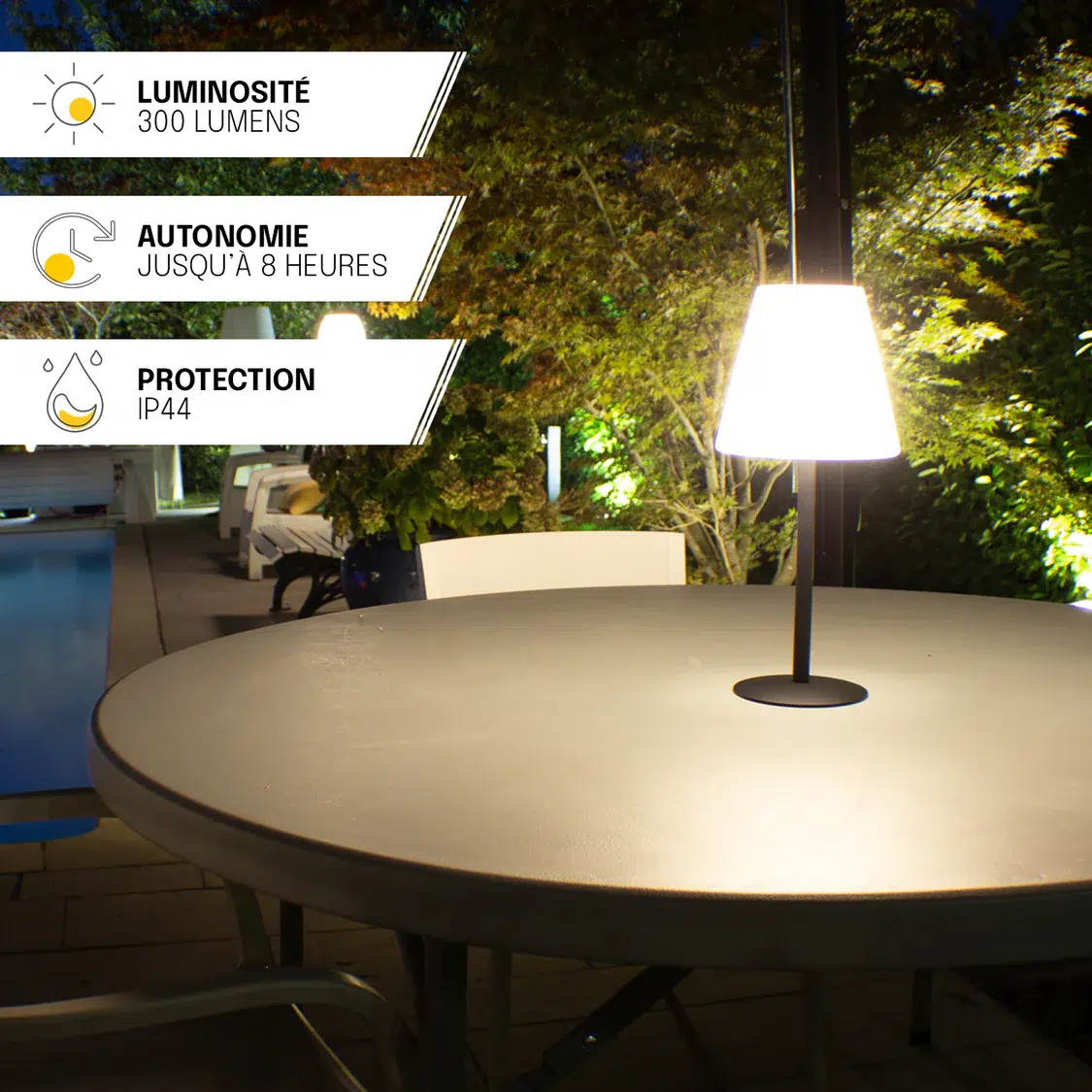 Avec une puissance de 300 lumens, elle diffuse une lumière douce, homogène et agréable. Son abat-jour design, allié à une structure en PE et métal, offre à la fois solidité, légèreté et esthétique. Elle est certifiée IP44, ce qui la rend résistante aux éclaboussures : parfaite pour une table de jardin, une terrasse ou un balcon.