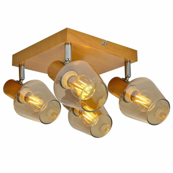 Plafonnier 4 Spots en Métal Effet Bois Naturel et Verre Ambré