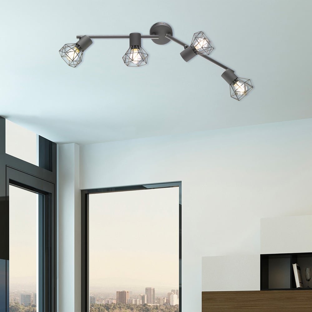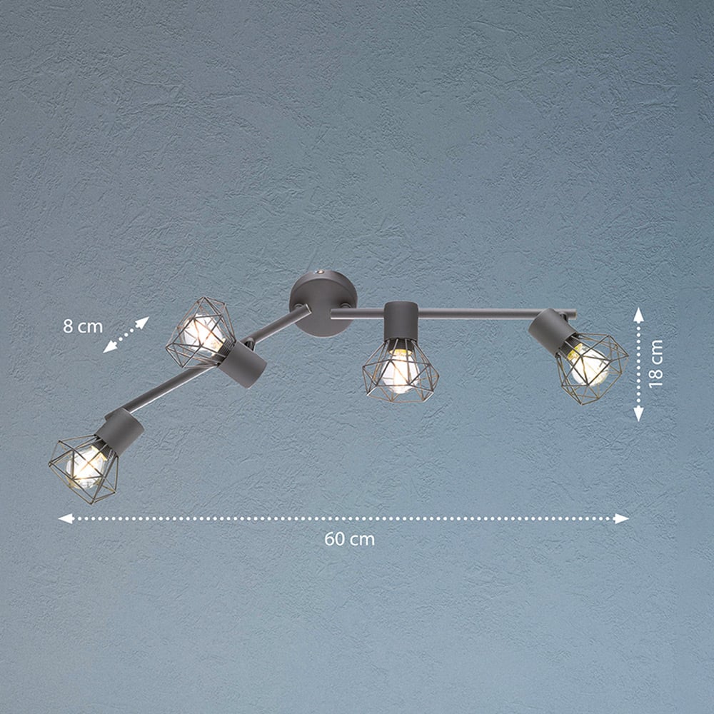 Apportez une touche élégante et fonctionnelle à vos pièces avec le plafonnier Ran. Ce luminaire polyvalent, adapté au montage mural ou au plafond, est doté de 4 sources lumineuses remplaçables individuellement. Fabriqué en métal gris mat, il allie robustesse et modernité. Idéal pour le salon, la chambre à coucher ou le couloir, Ran diffuse une lumière tout autour, offrant une ambiance lumineuse uniforme. Compatible avec des ampoules E14 (max. 4×40 W), ce plafonnier permet de choisir la couleur de lumière selon vos préférences. Conforme aux normes électriques allemandes, il est partiellement monté pour une installation simplifiée.
