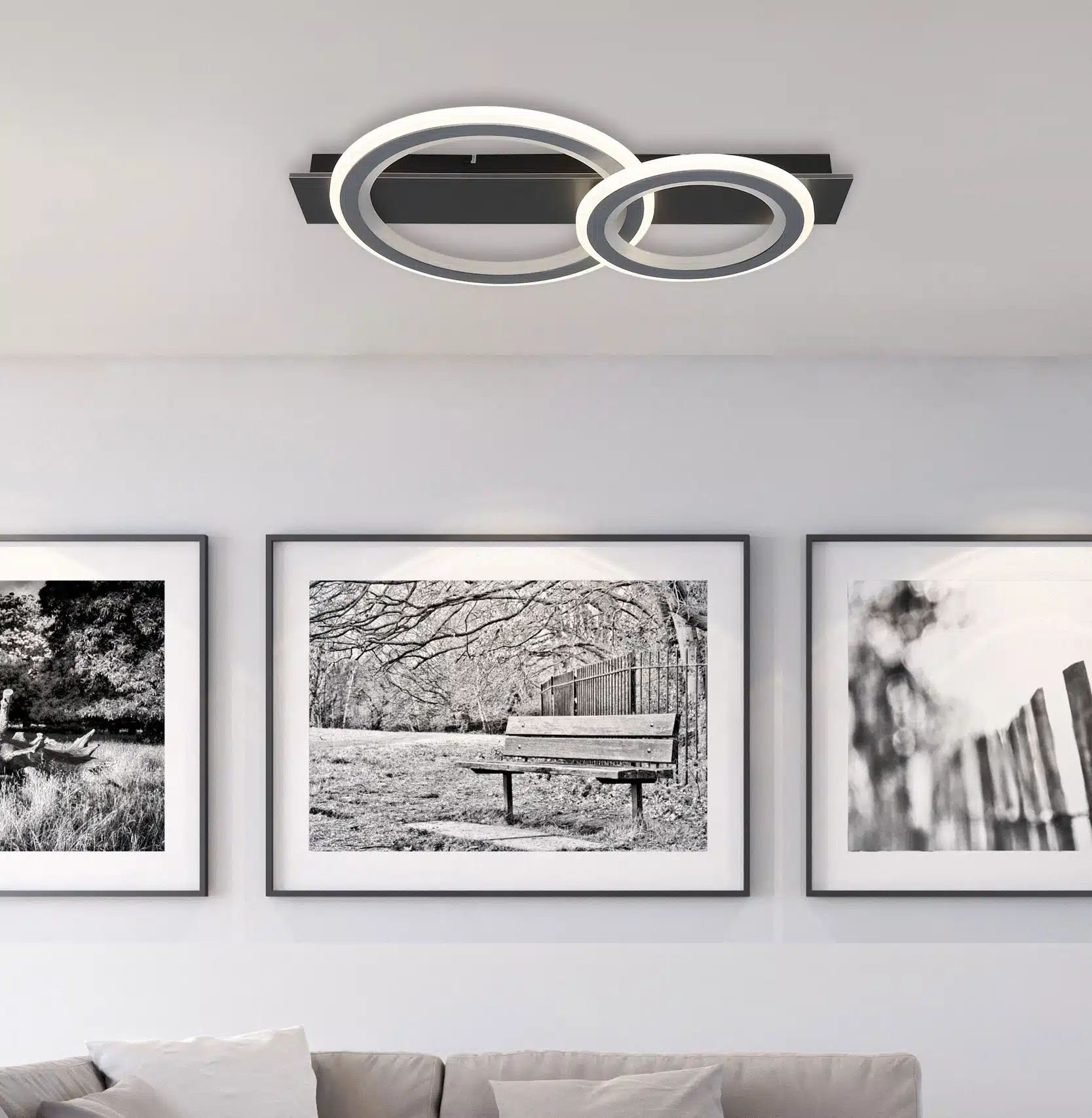 Le plafonnier JAYDEN impressionne par son design moderne et ses fonctions polyvalentes. L’enseigne murale rectangulaire avec deux anneaux décalés en combinaison avec le corps en métal noir, mat et plastique gris brossé confère à la lampe un look élégant et contemporain. L’abat-jour en métal gris clair et acrylique opale assure une répartition agréable de la lumière. Avec la télécommande incluse dans la livraison, vous pouvez régler la luminosité de la lumière à votre guise et activer le changement de couleur RVB. Choisissez parmi une large gamme de couleurs qui peuvent être fixées ou profitez de l’effet arc-en-ciel fascinant. La température de couleur est réglable de 2 700 K à 6 500 K, afin que vous puissiez toujours choisir la lumière idéale pour chaque humeur et activité. Avec une taille de 630 mm x 350 mm, le plafonnier JAYDEN est un choix parfait pour les espaces de vie modernes. La fonction mémoire enregistre vos derniers paramètres.