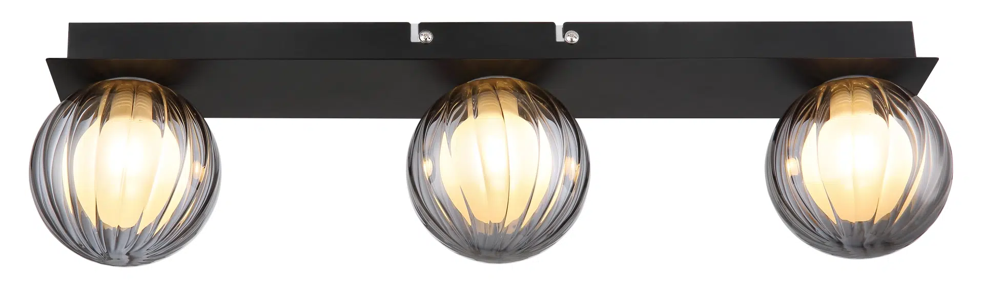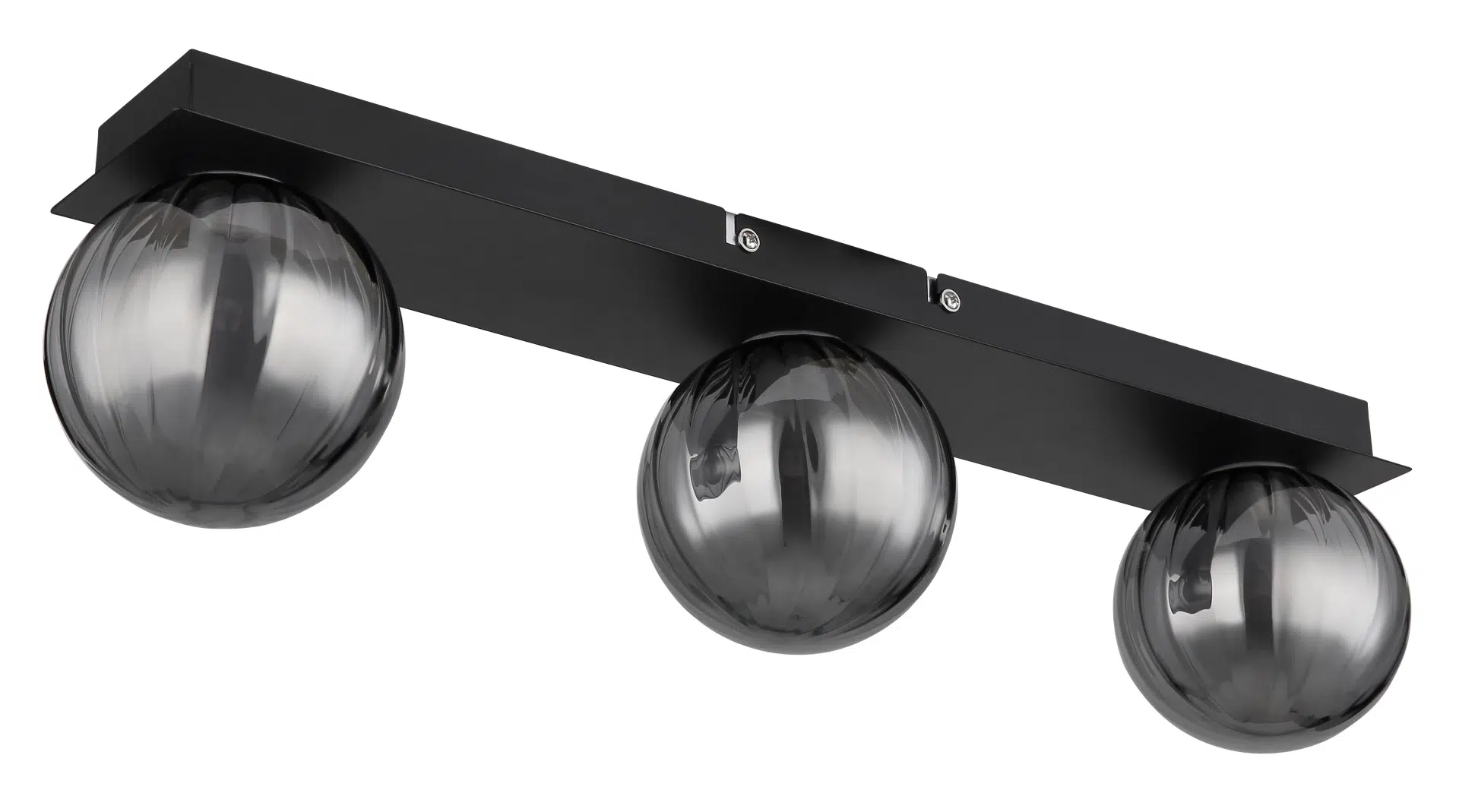 - Design contemporain : Corps en métal noir mat avec des abat-jour sphériques en verre fumé et satiné.
