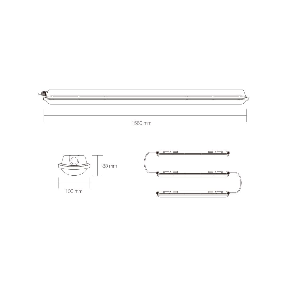 LUMINAIRE ETANCHE PORTO 56W 5600lm IP65 120° 1500x72x58mm Luminaires innovants, faciles à utiliser et de haute qualité. Doté d’une puissance de 56W pour un rendu lumineux de 5600lm, ce luminaire peut remplacer directement un luminaire étanche traditionnel avec lampes fluorescentes de 18W à 58W. Avec leur design compact et élégant, le modèle PORTO conserve leur architecture bien connue et appréciée. Leur installation est simple et rapide, grâce à leur conception efficace. Ce luminaire Etanche offre une excellente distribution de la lumière via un faisceau extensif pour un éclairage simple et efficace. Son boîtier étanche en polycarbonate de qualité supérieure est certifié IP65 : il est résistant à la poussière, à la corrosion et aux liquides, permettant son utilisation aussi bien en extérieur qu’en intérieur dans des environnements sujets à l’humidité et aux projections d’eau et de vapeur. Prêts à être utilisés avec des passerelles, et/ ou avec des capteurs. Installation en saillie ou en suspension. Angle de faisceau : 120° Consommation énergétique : A+ IRC : > 80 Alimentation : 220-240V AC Dimensions : 1500x72x58mm Garantie constructeur : 3 ans Normes : CE, ROHS , EMC
