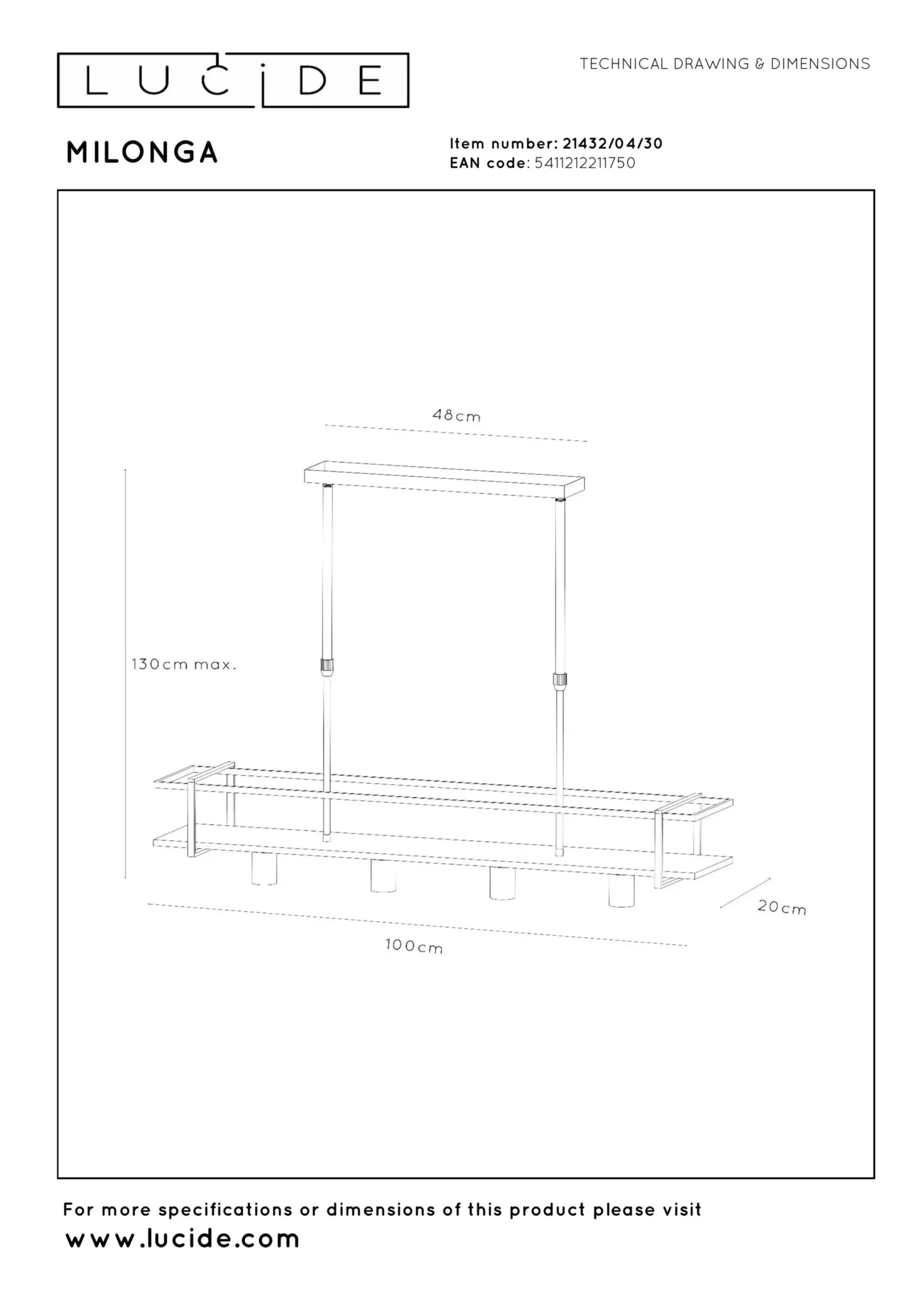Dotée de 4 points lumineux répartis sur 1 mètre de long, la Milonga offre une lumière chaleureuse et homogène. Grâce à son système de réglage en hauteur, elle s’adapte à vos besoins : ajustez facilement sa position entre 90 et 130 cm selon votre espace et vos envies.