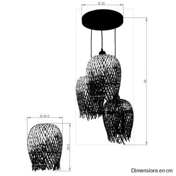 Un charme authentique et chaleureux, on adore cette superbe suspension cascade de la collection VAYLA. Conçue sur une structure en métal noir, elle possède trois points lumineux fabriqués en bambou naturel qui apporteront sans aucun doute une touche bohème tendance à votre décoration intérieure. Parfaite dans votre salon ou bien au-dessus de votre table à manger pour illuminer votre quotidien et vos moments de partage, cette belle suspension cascade accompagnera votre quotidien avec modernité et se mariera parfaitement dans votre aménagement intérieur. Notre astuce déco : optez pour de belles ampoules décoratives avec filaments et donnez une touche vintage à cette jolie suspension cascade VAYLA ! Luminaire équipé de trois douilles E27 compatibles avec trois ampoules d'une puissance maximale de 60W chacune, soit 3x60W (ampoules non incluses). Dimensions : hauteur totale minimum 94cm (hauteur réglable) x longueur câble 94cm x hauteur des abats-jours 20cm / 30cm / 50cm x diamètre 30cm. Existe également dans la même collection VAYLA en version suspension barre, suspension multiple ou bien pied de lampe.