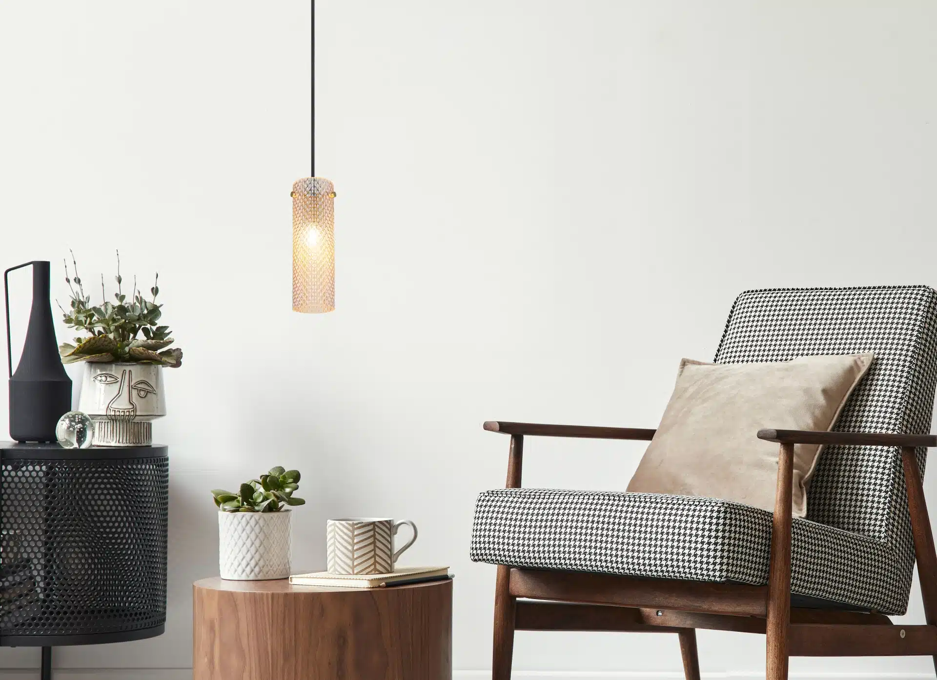 Suspension KAROLO – l’élégance dans une forme dorée. La suspension ronde KAROLO impressionne par son design élégant et crée une atmosphère élégante dans n’importe quelle pièce. Le corps en métal doré s’harmonise parfaitement avec le verre cylindrique à structure en nid d’abeille, qui offre des reflets de lumière fascinants. L’abat-jour en verre de couleur ambre diffuse une lumière chaleureuse et invitante qui crée une atmosphère chaleureuse. Avec un diamètre de 100 mm, la lampe est idéale pour les petites pièces, comme éclairage d’accentuation ou au-dessus d’une table. La douille E14 (non incluse) vous permet de choisir l’ampoule afin de régler l’intensité lumineuse à votre guise. La suspension KAROLO combine un éclairage fonctionnel avec un design élégant et constitue un choix parfait pour les espaces de vie modernes qui nécessitent un élément luxueux mais intemporel.