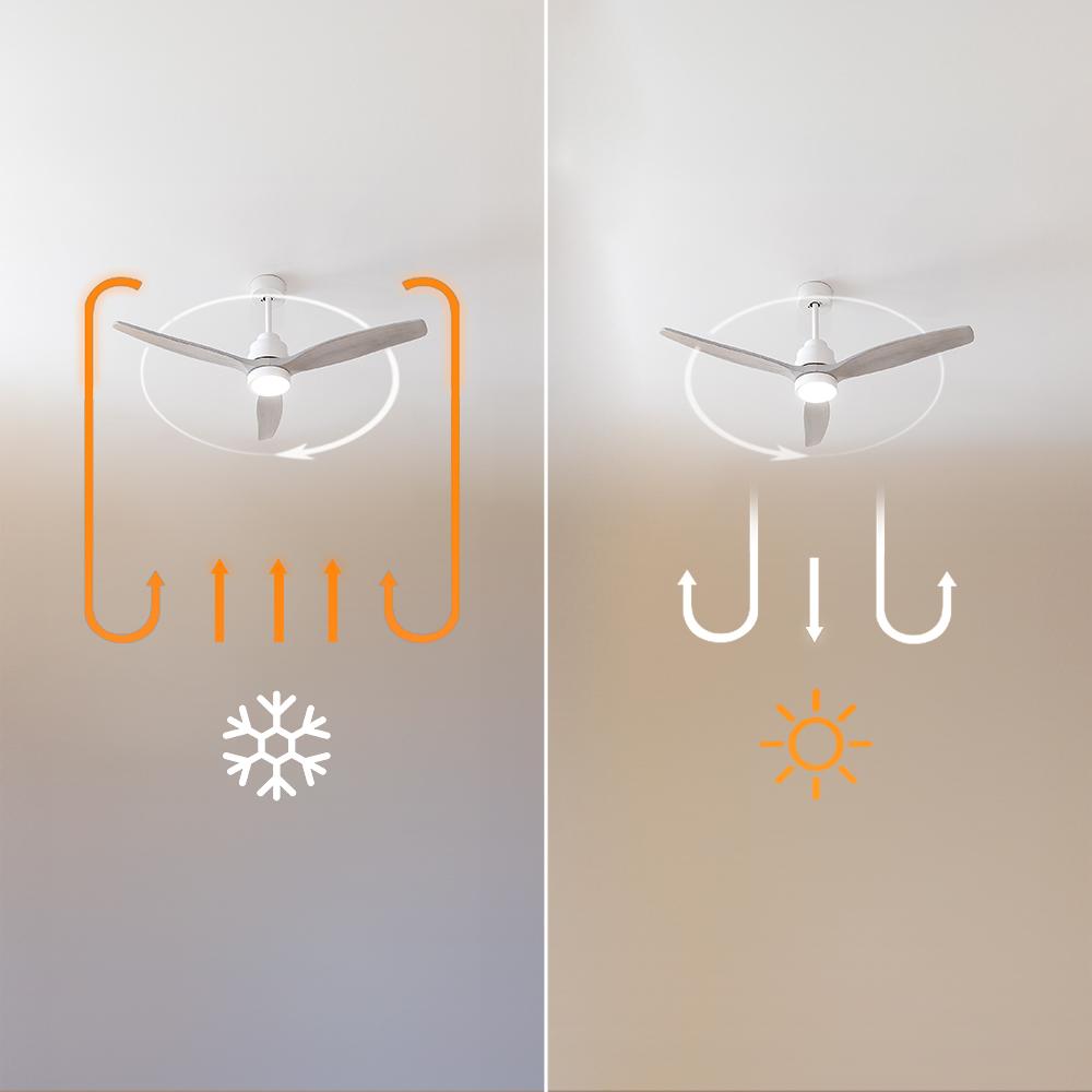 Le système d’inversion de rotation du moteur assure une utilisation tout au long de l’année. En été, le ventilateur crée une brise rafraîchissante, tandis qu’en hiver, il redistribue l’air chaud accumulé au plafond vers le sol, optimisant ainsi votre système de chauffage.