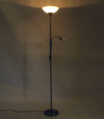 Ce lampadaire possède 2 avantages : il est muni d’une vasque en plastique et sa liseuse, parfaite pour de l’éclairage d’appoint. Le lampadaire possède un double interrupteur pour choisir soit l’éclairage principal, soit l’éclairage d’appoint de la lisseuse ou bien les deux.
