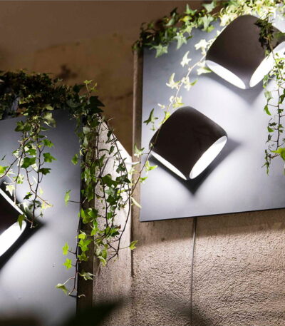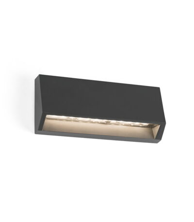 Applique pour éclairage extérieur en aluminium injecté et en verre transparent. Cette applique LED possède des ailettes directionnelles qui permettent de contrôler le faisceau de lumière pour obtenir un éclairage fonctionnel mais également décoratif.